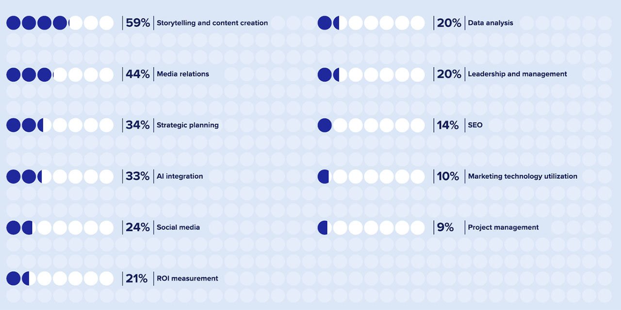 The skills solution: For all of its perceived challenges, 48% also recognize AI as a huge opportunity for its ability to drive efficiency and insights. PR pros who can leverage AI in everything from media monitoring to content creation and data analysis will emerge ahead. (The key is balancing these cutting-edge tech capabilities with creative judgment to amplify rather than replace the human-led approach that defines great PR.)