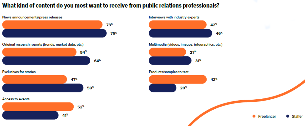 PR teams who want earned media coverage for their products or events may have more luck reaching out to independent journalists. They expressed more interest in access to events (52% versus 41% for staff reporters) and products or samples to test (42% versus just 20% for staff journalists). Full-time staff showed much more interest in original research and exclusives for stories.