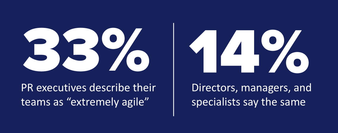 The media landscape and audience behaviors are shifting faster than ever. The most successful PR teams will be the ones who can learn, adjust, and iterate quickly. Yet according to our findings, only 56% of PR professionals describe their teams as “very” or “extremely” agile — and executives overestimate agility at twice the rate of their staffs (33% versus 14%). This gap shows that while agility is a top goal, structural barriers like team size, data access, and slow decision-making still hold many back. PR teams who resolve to identify and break down those barriers to agility will find themselves better positioned for success in 2026 – and beyond.