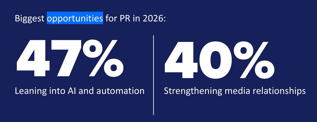 Even as 47% of PR pros say AI and automation are their biggest opportunity for 2026, 40% still point to “strengthening journalist and creator relationships” as a top focus. Relationships remain the beating heart of PR - and they can’t be automated. PR teams that resolve to invest even more time and energy in building relationships with those who can help increase brand awareness (the number one goal for brand for 2026, according to our research) will reap the greatest benefits.