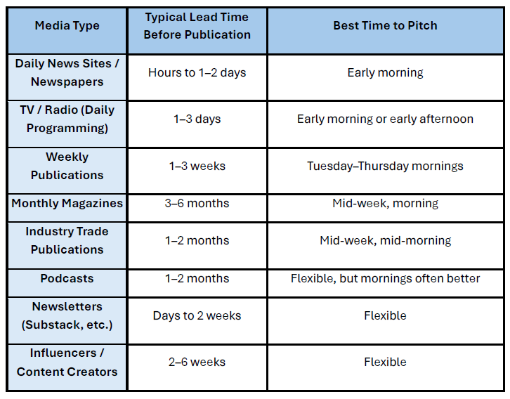 To make timing even more strategic, consider this quick-reference guide outlining the optimal outreach windows (in general) for daily news, weekly publications, monthly magazines, and emerging channels.