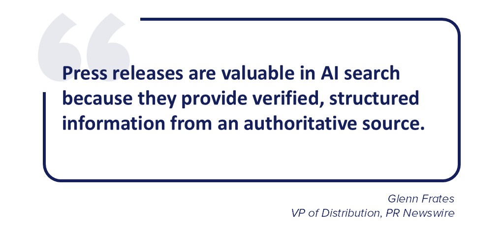 "Press releases are valuable in AI search because they provide verified, structured information from an authoritative source," says Glenn Frates, VP of Distribution, PR Newswire. "AI models are designed to prioritize clarity, consistency and attribution – all of which are built into the press release format. When releases are distributed through trusted newswires, they become reliable reference points that AI systems can confidently cite."